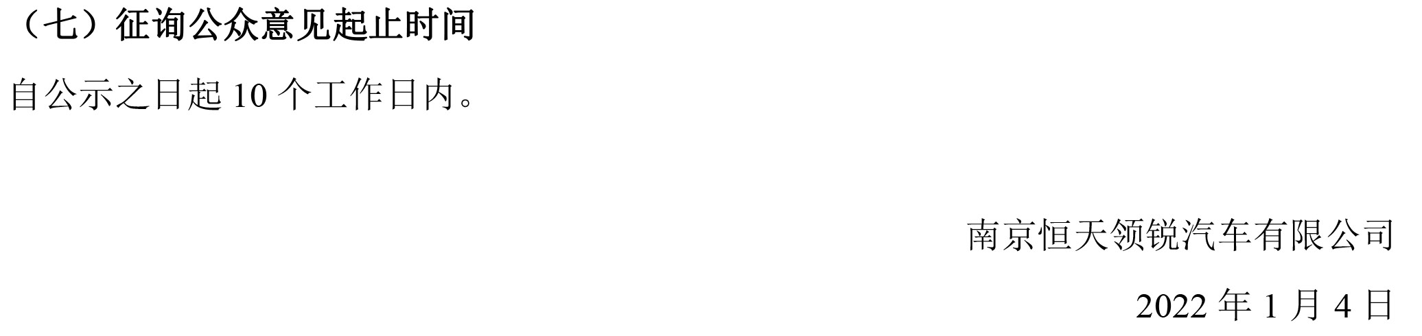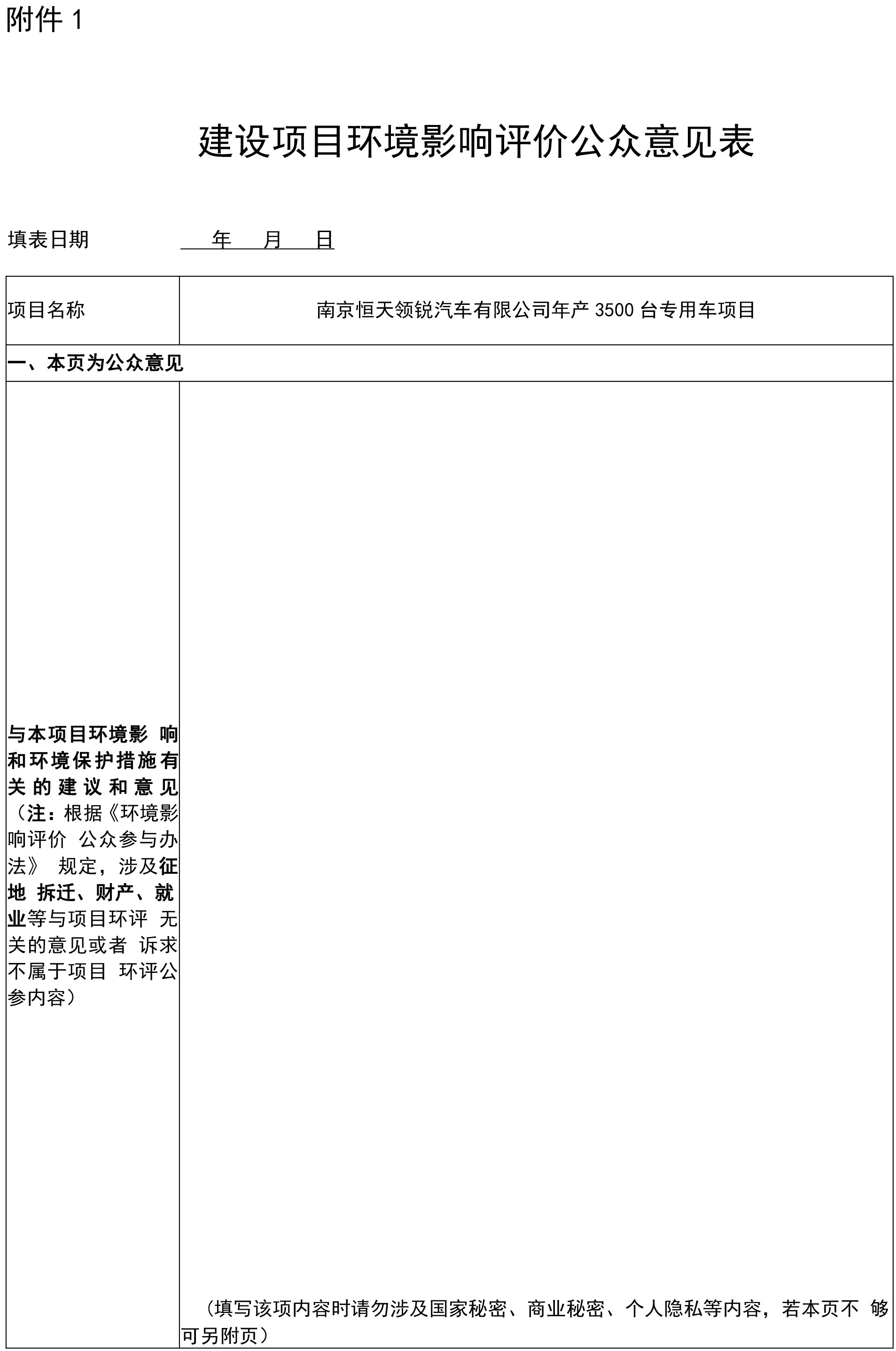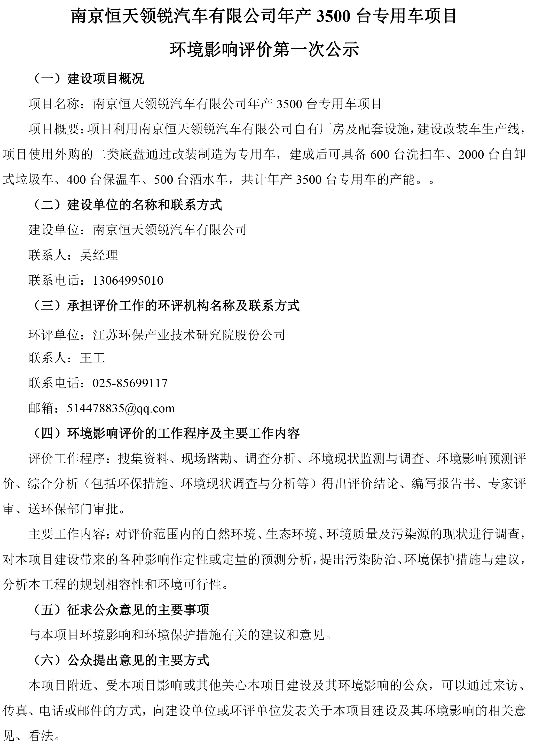 南京恒天領銳汽車有限公司年產3500臺專用車項目 環境影響評價第一次公示